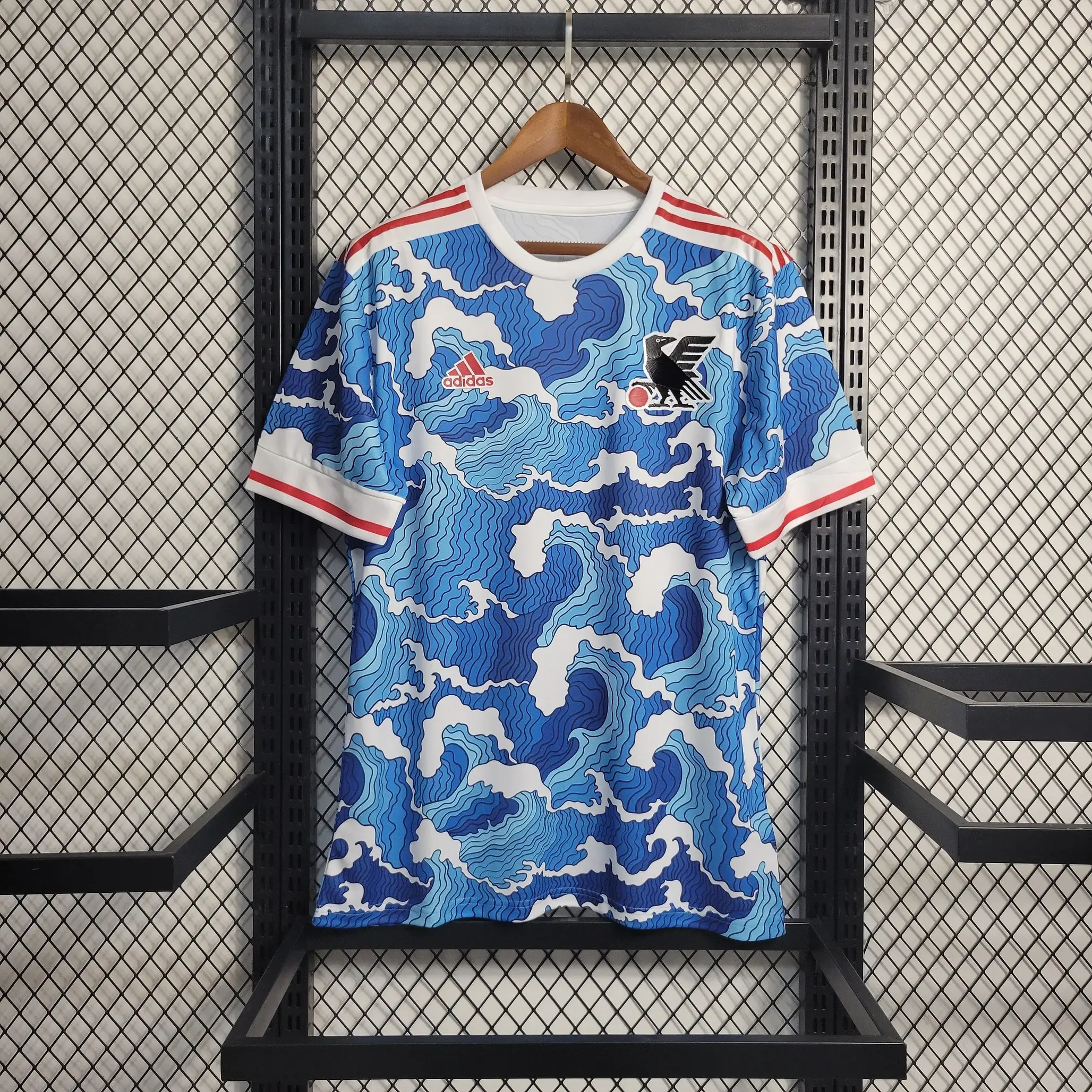 Les touches blanches et rouges rappellent le drapeau du pays du Soleil-Levant, tandis que les nuances de bleu apportent une profondeur visuelle unique, digne d’une équipe connue pour sa discipline et son élégance sur le terrain.